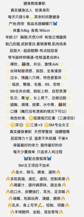 辣辣健身教练,蜜桃臀很大,假期终于约到了一次,大屁股控最爱了,玩了个包时套餐1800玩两个小时随意射,磨棒舒服的射了一次,女上位后入看着那大屁股形变加上小姐姐的叫声,真的太销魂了,有kiss有69、磨棒丝袜,舌吻可以吃个够,单约一次是800,包夜3000。
